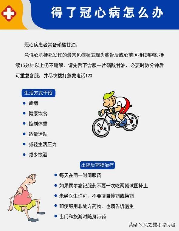 Les patients atteints de maladie coronarienne améliorent leur mode de vie tout en veillant à une utilisation raisonnable des médicaments ; ils devraient généralement prendre de l'aspirine à long terme après les statines et veiller à ce que la pression artérielle, la glycémie et les lipides sanguins soient conformes aux normes ; en cas de crise d'angine de poitrine, ils devraient toujours prendre de la nitroglycérine. En cas de crises d'angine fréquentes, de sténose coronaire supérieure à 75 % ou d'infarctus du myocarde, il est recommandé de poser un stent et, pour les lésions complexes, d'opter pour un pontage aorto-coronarien.