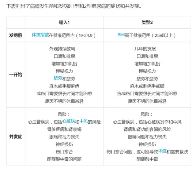 Le diabète de type 1 est un manque absolu d'insuline, le plus souvent chez les adolescents, le corps est mince, il faut compter sur un traitement à l'insuline, sujet à l'acidocétose diabétique et à d'autres complications. Le diabète de type 2 est un manque relatif d'insuline ou une résistance à l'insuline, le plus souvent chez les personnes d'âge moyen et les personnes âgées, le corps est d'abord obèse, il peut être traité avec des médicaments oraux ou de l'insuline injectable.