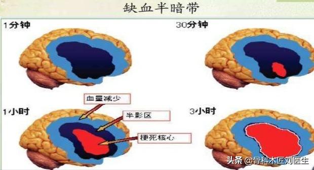 👆👆👆 这是脑梗死的缺血半暗带,脑组织缺血1分钟组织就开始缺血缺氧,脑细胞开始发生变化。30分钟就能看到明显的梗死灶,随后梗死灶逐渐扩大!3个小时候和刚开始对比,梗死范围已经非常大了! Par conséquent, les patients atteints d'infarctus cérébral sont dans une course contre la montre, courir vite avec un taux de survie élevé et un taux d'invalidité faible, courir lentement avec un taux de survie faible et un taux d'invalidité élevé !