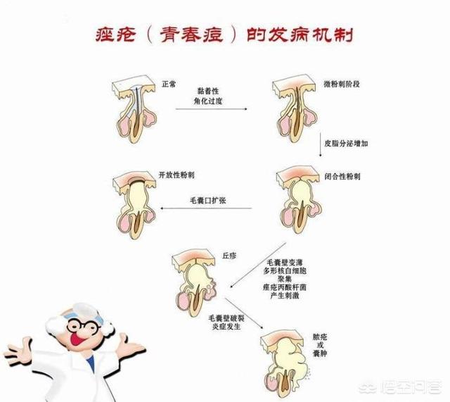 Les boutons sont une manifestation précoce de l'acné. Les boutons, les papules rouges, les pustules, les kystes et les nodules sont des manifestations de l'acné. La pathogénie est illustrée dans la figure. L'acné se forme lorsque les glandes sébacées produisent beaucoup de sébum et que les canaux folliculaires sont anormalement kératinisés, ce qui bloque la sécrétion et l'évacuation du sébum. Lorsque le sébum augmente, la bactérie locale Propionibacterium acnes se multiplie et l'acné se transforme en boutons rouges et en pustules.