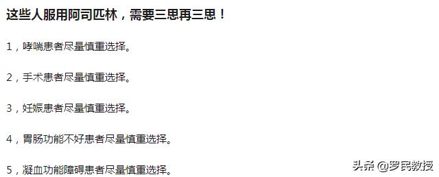Les groupes de personnes suivants devraient être contre-indiqués l'utilisation de l'aspirine, principalement : ① saignement gastro-intestinal actif ; ② saignement du corps ; ③ grave insuffisance cardiaque, hépatique et rénale ; ④ allergique à l'aspirine ; ⑤ le dernier trimestre de la grossesse. Nous devons également prêter attention à la surveillance dans l'utilisation du processus en raison de l'apparition d'effets secondaires, j'espère que nous comprenons correctement que l'aspirine est un médicament, dont l'utilisation doit strictement saisir les indications, ne doit pas être utilisé à l'aveuglette.