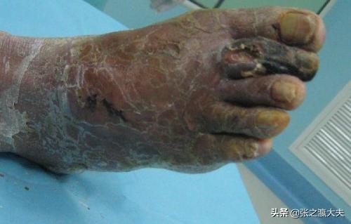 1. le pied diabétique. La maladie peut se manifester par l'apparition d'une sensation anormale au niveau du pied (par exemple, un engourdissement froid), par l'assombrissement et l'approfondissement de la couleur de la peau, par l'apparition d'ulcères, puis par la gangrène, avec une odeur nauséabonde (reproduction de bactéries anaérobies), et enfin par des lésions suffisamment graves pour entraîner l'amputation du membre. La cause première de cette lésion est un mauvais contrôle de la glycémie, qui met l'organisme en état d'hyperglycémie, laquelle empoisonne les nerfs et les vaisseaux sanguins et affaiblit le rôle des phagocytes. En fin de compte, cela provoque des sensations anormales dans les membres inférieurs, et le patient est incapable d'éviter le danger et est sujet aux blessures. La circulation sanguine dans les membres inférieurs est réduite, la fonction de réparation est affaiblie et la plaie n'est pas facile à cicatriser. L'infection finit par s'aggraver jusqu'à la gangrène.