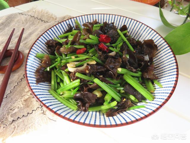 350 g de céleri, 10 g de champignons noirs, 1 oignon vert, 3 gousses d'ail, 2 tranches de gingembre, 2 piments séchés, 3 cuillères à soupe d'huile d'arachide, 2 g de sel, 2 cuillères à soupe de sauce soja légère.