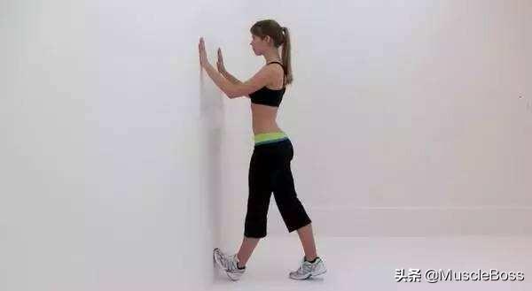 Trouvez une marche ou tenez-vous contre un mur, faites un pas en avant avec un pied, accrochez votre cou-de-pied, gardez votre corps droit, tenez le mur avec les deux mains et penchez votre corps vers l'avant pour sentir l'étirement dans vos mollets.