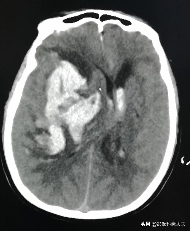 Plus de la moitié des hémorragies intracérébrales sont causées par l'hypertension artérielle, c'est pourquoi nous disons souvent que nous devons prendre des médicaments contre l'hypertension artérielle, même en l'absence de symptômes, par crainte d'une hémorragie cérébrale soudaine, et en prenant des médicaments pour contrôler la tension artérielle au bon niveau, nous pouvons réduire considérablement le risque d'hémorragie cérébrale. Les autres causes d'hémorragie intracérébrale sont les anévrismes, les malformations vasculaires cérébrales, les accidents vasculaires cérébraux dus à des tumeurs cérébrales et les complications d'un traitement anticoagulant. L'hémorragie intracérébrale peut être associée à de violents maux de tête, à des vomissements et à l'apparition précoce de symptômes neurologiques tels que l'hémiparésie, les troubles de la parole et l'épilepsie (c'est-à-dire que la personne entière ne réagit pas). Les hémorragies du tronc cérébral et du cervelet peuvent également se manifester par des vertiges. La photo ci-dessous montre un patient souffrant d'une hémorragie intracérébrale (zone blanche sur la photo ci-dessous), ayant des antécédents d'hypertension, qui s'est soudainement effondré alors qu'il faisait du vélo dans la rue.