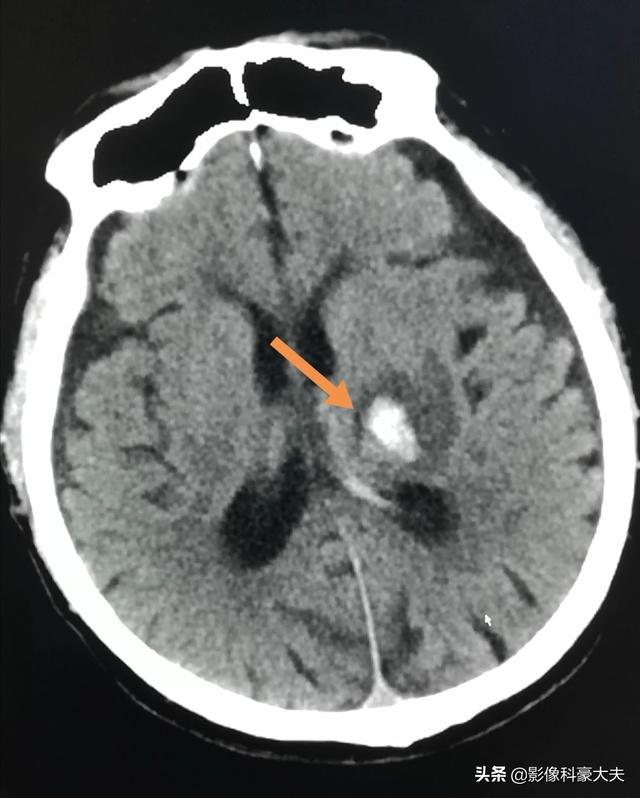 Ce patient, âgé de 52 ans, a été admis pour des maux de tête soudains et un scanner a clairement montré une hémorragie cérébrale thalamique gauche. Cette petite hémorragie est généralement mieux traitée et ne laisse pas de séquelles graves.