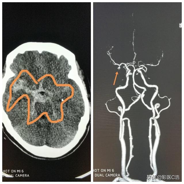 L'hémorragie sous-arachnoïdienne est principalement causée par des anévrismes intracrâniens et des malformations vasculaires cérébrales (spinales), qui représentent environ 70 % des hémorragies sous-arachnoïdiennes spontanées, suivis par l'artériosclérose hypertensive, la maladie tabagique et les maladies du sang. Le pronostic global de l'hémorragie sous-arachnoïdienne spontanée est mauvais et le taux d'invalidité des survivants est relativement élevé. La plupart des patients présentent un début rapide de la maladie, sans symptômes d'aura, se manifestant par des céphalées sévères, une photophobie, des nausées, des vomissements, une pâleur, des sueurs froides, parfois accompagnés d'épilepsie, de vertiges, de douleurs au niveau du cou et des épaules ou des membres inférieurs, et environ la moitié des patients présentent des symptômes mentaux, tels que l'agitation, la confusion, la désorientation, etc. Dans les cas graves, le patient peut tomber dans le coma, voire subir une hernie cérébrale et mourir. J'ai rencontré un patient de ce type, un garçon de 25 ans, entraîneur de fitness, qui a subi une rupture soudaine d'un anévrisme cérébral et une hémorragie, qui a été sauvé pendant longtemps, mais dont le pronostic est très sombre. La photo ci-dessous montre un patient souffrant d'une rupture d'anévrisme cérébral (flèche droite) et d'une hémorragie (zone blanche encerclée à gauche), ayant des antécédents d'hypertension, se disputant avec quelqu'un et s'effondrant soudainement sur le sol.