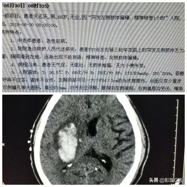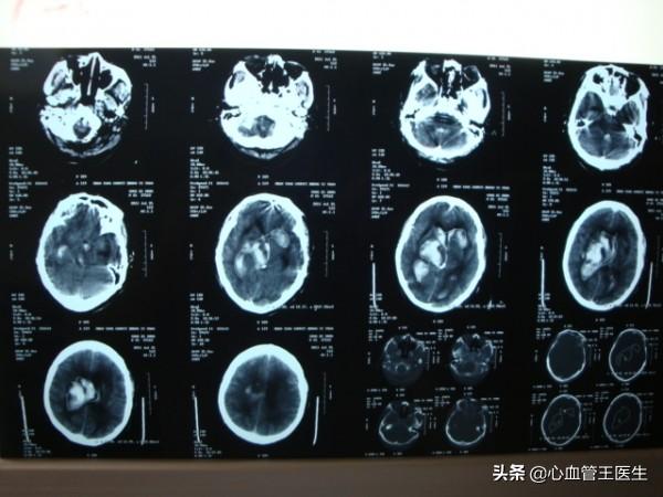 120 La pression artérielle a été mesurée à 200/100, tandis que la perfusion a été envoyée à l'hôpital, où l'on a procédé d'urgence à une tomodensitométrie cérébrale qui a d'abord révélé une hémorragie cérébrale.