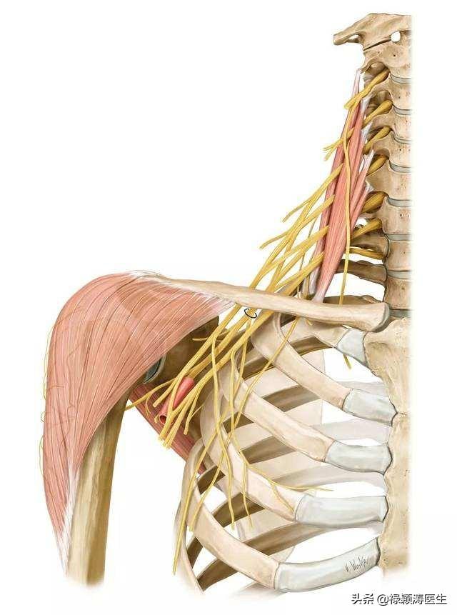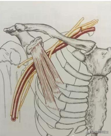 Les nerfs du plexus brachial pénètrent le muscle trapèze et se divisent en nerfs cubital, radial et médian ; le nerf radial passe de l'aisselle à l'arrière du bras, et les nerfs cubital et médian descendent sous le muscle petit pectoral. Une lésion du muscle pectoral mineur accompagnée d'une spasticité bloquant les nerfs qui le traversent provoque une douleur et un engourdissement au niveau du coude, du bras et de la partie cubitale de la main, y compris l'auriculaire, le majeur et l'annulaire.