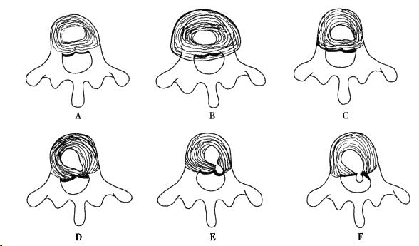 F. Disques intervertébraux libres.Le noyau pulpeux traverse l'anneau fibreux complètement rompu et ses ligaments postérieurs et est libre dans le canal rachidien.
