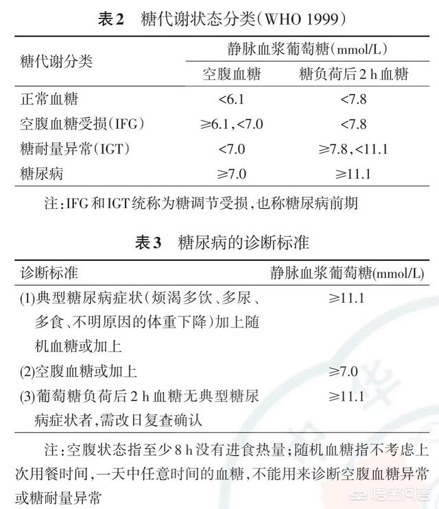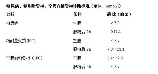 Le diabète sucré peut être diagnostiqué si la glycémie à jeun (définie comme l'absence de nourriture pendant au moins 8 heures) est ≥7 mmol/L, ou ≥11,1 mmol/L 2 heures après un repas. Aux États-Unis, le critère diagnostique de l'hémoglobine glycosylée >6,5 % est également utilisé. Le diabète sucré peut également être diagnostiqué si le test de tolérance au glucose (OGTT) est toujours ≥11,1 mmol/L 2 heures après le repas. Le diagnostic peut être posé si l'un des trois critères ci-dessus dépasse les critères de diagnostic. La glycémie mesurée par prélèvement de sang veineux à l'hôpital doit être considérée comme la norme, et la glycémie mesurée par un lecteur de glycémie à domicile ne peut être utilisée que comme référence, et non comme donnée diagnostique.