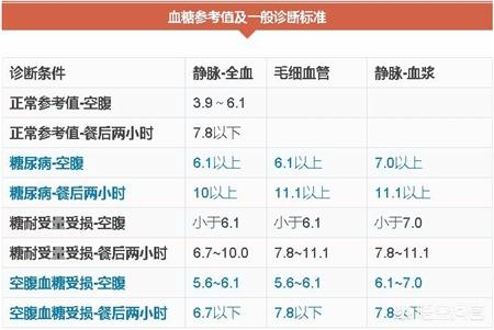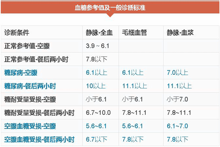 Prenons comme référence la glycémie plasmatique veineuse vérifiée à l'hôpital : la glycémie à jeun d'une personne normale est inférieure à 6,1 et inférieure à 7,8 après le repas. Les critères de diagnostic du diabète sont les suivants : glycémie à jeun > 7,0, glycémie 2 heures après le repas > 11,1 ; si l'un des critères est rempli et accompagné des symptômes typiques de trois de plus et d'un de moins, on peut en principe diagnostiquer un diabète sucré.