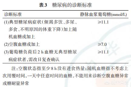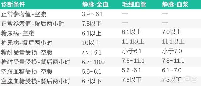 Le diagnostic de diabète sucré requiert l'un des éléments suivants :① symptômes diabétiques typiques (manger, boire, uriner, perdre du poids de façon excessive) plus une glycémie aléatoire ≥ 11,1 mmol / L ou une glycémie à jeun ≥ 7,0 mmol / L ou une HGPO 2 heures après une glycémie ≥ 11,1 mmol / L ; ② pour les personnes sans symptômes diabétiques évidents, si l'indice de glycémie atteint les critères ci-dessus, il faut recontrôler un autre jour l'un ou l'autre des indices ci-dessus, et s'il répond toujours aux critères de glycémie ci-dessus, le diagnostic peut être posé. Si les critères de glycémie ci-dessus sont toujours remplis, le diagnostic peut être posé.. (voir tableau ci-dessous)