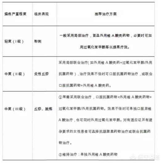 Le traitement médicamenteux doit respecter le principe de base d'un traitement gradué, les différents types d'acné devant être traités de manière différente. Se référer au tableau suivant pour un traitement spécifique :