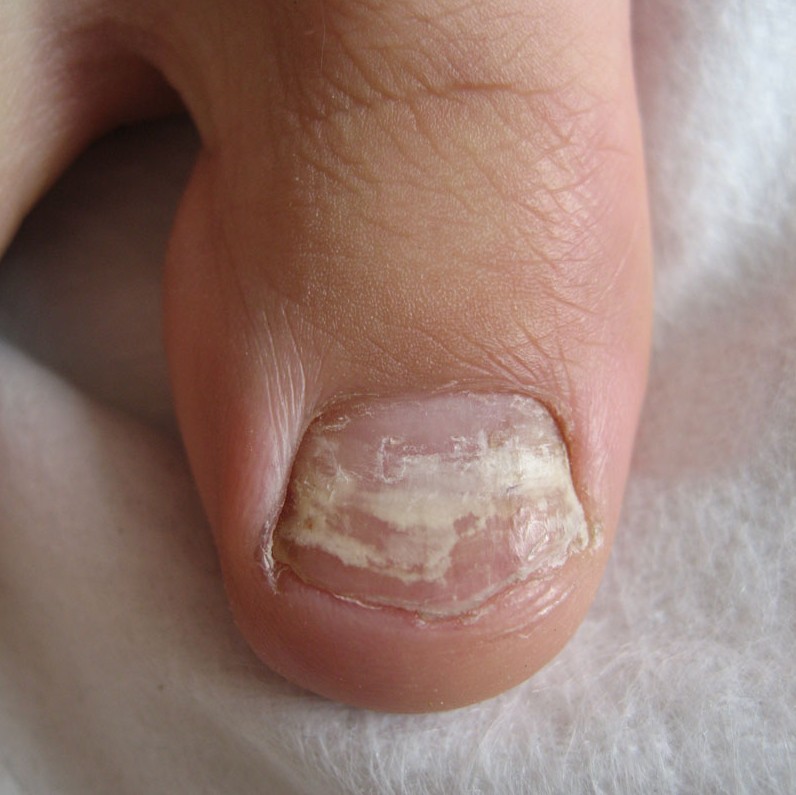 2. la stratification de l'ongle : les cuticules épaissies deviennent sèches et cassantes, le champignon envahit la plaque de l'ongle à partir de la plaque de l'ongle et le lit de l'ongle entre la chute, de sorte que la couche superficielle de l'ongle d'origine liée à la chair du doigt se sépare, en plus de la séparation d'une fine couche de texture de l'ongle pour adhérer à la chair du doigt.