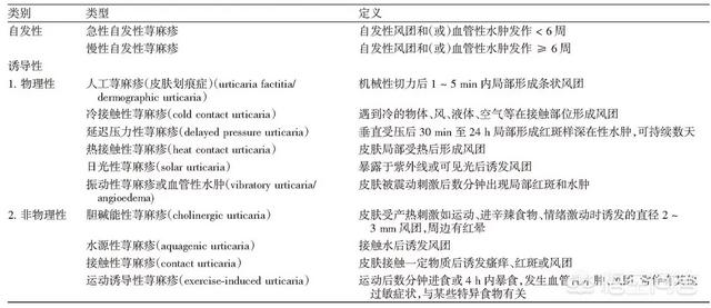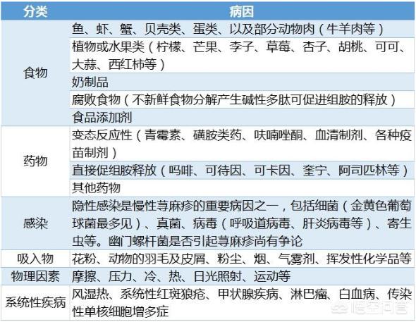 L'urticaire est une maladie allergique. En théorie, l'urticaire peut être déclenchée par tout ce qui est susceptible de provoquer des allergies, y compris les aliments que vous mangez, les additifs alimentaires, l'environnement dans lequel vous vivez, les stimuli solaires chauds et froids, les médicaments chinois ou occidentaux ou les produits sanguins, ainsi que les facteurs psychiatriques et psychologiques, certaines maladies, etc. Cependant, de nombreux cas d'urticaire pour lesquels aucune cause ne peut être trouvée sont appelés urticaire chronique spontanée. La classification de l'urticaire est présentée dans le tableau ci-dessous.