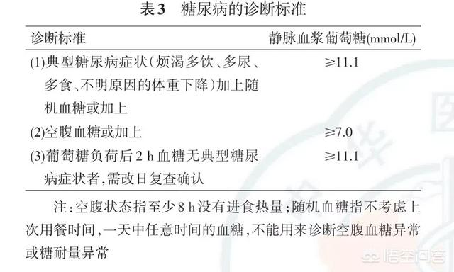 Selon les lignes directrices chinoises de 2017 pour la prévention et le contrôle du diabète, le diagnostic international actuel reste la norme de diagnostic de l'OMS de 1999. Le diagnostic du diabète sucré est basé sur 1. les symptômes typiques du diabète sucré. 2. une glycémie à jeun élevée supérieure à 7,0 mmol/L. 3. ou / et la charge de glucose après 2 heures est supérieure à 11,1 mmol / L. S'il n'y a pas de symptôme typique, il faut examiner un autre jour pour confirmer.
