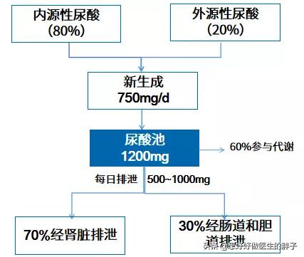 Nous devons encore regarder le tableau ci-dessus, la formation métabolique finale de l'acide urique de notre corps est d'environ 500 à 1 000 milligrammes, dont 70 % sont excrétés par les reins dans l'urine, et les 30 % restants sont excrétés par le tractus intestinal et le tractus biliaire.