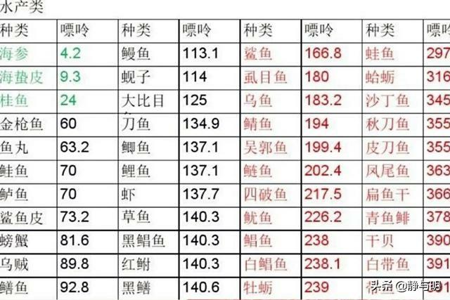 Deuxièmement, pour vous aider à faire la différence entre les aliments à teneur faible, moyenne et élevée en purine, la rubriqueLa teneur en purine de 100 grammes de denrées alimentaires est faible si la teneur en purine est inférieure à 50 mg, moyenne si la teneur en purine de 100 grammes de denrées alimentaires est comprise entre 50 mg et 150 mg, et élevée si la teneur en purine de 100 grammes de denrées alimentaires est supérieure à 150 mg.Le tableau suivant indique la teneur en purine des poissons : en vert, la teneur en purine est faible, en noir, la teneur en purine est moyenne, en rouge, la teneur en purine est élevée. Vous pouvez constater que la teneur en purine de la cannelle (24 mg) est faible, mais si vous mangez de la cannelle, la teneur en purine n'augmentera-t-elle pas ? Ou bien la cannelle avec d'autres purines moyennes peut-elle être consommée sans que la teneur en purine n'augmente ? Si la teneur en purine augmente, il n'y a pas de différence entre un régime riche en purine et un régime riche en purine, ce qui entraînera une augmentation de l'acide urique. Par conséquent, le choix d'un régime et d'une alimentation raisonnable est au centre de l'attention des patients souffrant d'un taux élevé d'acide urique.