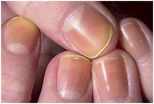 Les ongles sont blancs au milieu et noirs sur les bords.Il s'agit probablement d'une hépatite.