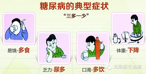 Les premiers symptômes du diabète les plus courants chez la plupart des patients sont "trois de plus et un de moins", c'est-à-dire polyurie, polydipsie, polyphagie et perte de poids. L'augmentation de la glycémie est due à une diurèse osmotique, suivie d'une augmentation de la consommation d'eau due à la soif. Les patients présentent une altération de l'utilisation du glucose par les tissus périphériques, une augmentation de la lipolyse, une altération du métabolisme des protéines, ainsi qu'une fonte musculaire progressive, de la fatigue, une perte de poids et une altération de la croissance et du développement chez les enfants. Afin de compenser la perte de sucre et de maintenir les activités de l'organisme, les patients semblent souvent avoir facilement faim et mangent plus en même temps, ce qui marque le début de ce que nous appelons les symptômes "trois de plus et un de moins".
