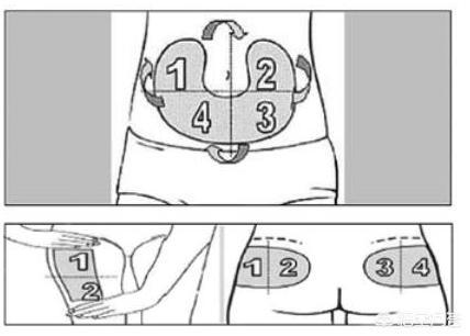 La peau plus lâche de l'abdomen est également un endroit où la graisse est plus abondante, moins susceptible de ressentir des douleurs et peut être injectée facilement en toute saison. L'abdomen peut être injecté dans un endroit large, l'injection des 2 cm les plus élevés du côté inférieur de la cage thoracique, l'extrémité la plus basse de l'articulation de l'os pubien à 1 cm au-dessus du côté. Le milieu est à 3 cm du nombril, et toutes les autres positions peuvent être injectées. Lors de l'injection de l'abdomen, on peut diviser l'abdomen en quatre zones : supérieure gauche, inférieure gauche, supérieure droite, inférieure droite, avec à chaque fois une rotation de l'injection.