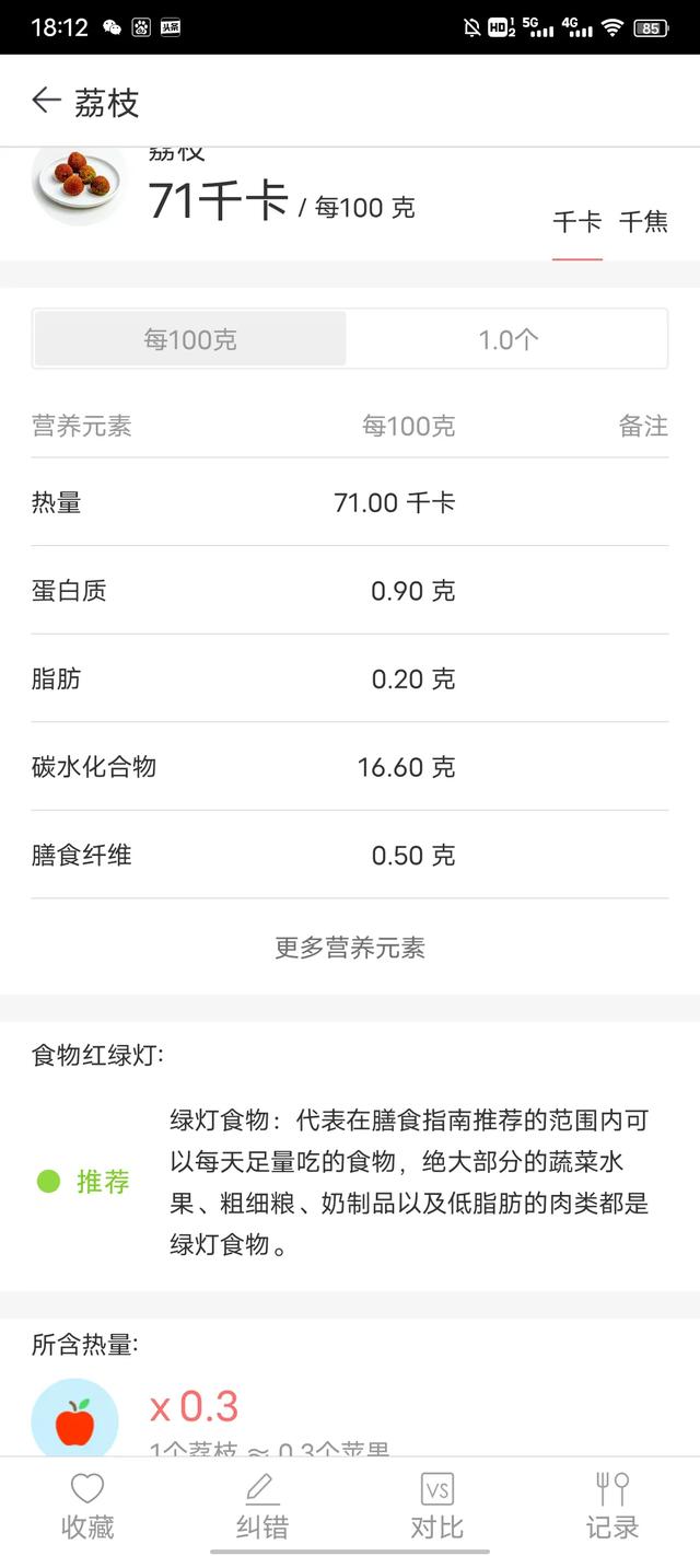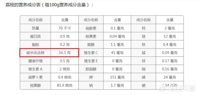 Ensuite, nous examinons directement les données relatives au litchi : indice glycémique (IG) du fructose de 23, chaque litchi de 100 g contient 16,1 g, puis nous prenons 500 g (c'est-à-dire un demi-catalogue) comme exemple pour calculer, 16,1 × 500/100 = 80,5 g ; charge glycémique (CG) = 80,5 × 23/100 = 18,5, 18,5 est inférieur à 20.