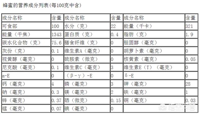 Le tableau ci-dessus montre que le miel est riche en hydrates de carbone, c'est-à-dire en sucre (jusqu'à 75 % ou plus), et qu'il ne contient qu'une petite quantité de vitamines et de protéines, et presque pas de minéraux. On peut dire qu'il s'agit d'un aliment riche en calories et d'une valeur nutritionnelle relativement unique, la valeur nutritionnelle globale n'étant vraiment pas élevée.