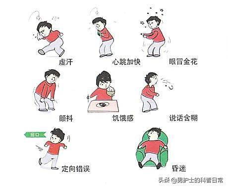 Il existe également ce que l'on appelle la "réaction hypoglycémique", qui survient principalement dans le cadre du traitement du diabète, en raison d'une chute trop rapide ou trop importante de la glycémie du patient sur une courte période, bien que sa glycémie reste dans la fourchette normale, voire légèrement supérieure à la valeur normale, le patient sera toujours pris de panique, transpirera, aura les mains qui tremblent, aura faim et présentera d'autres symptômes de l'hypoglycémie.