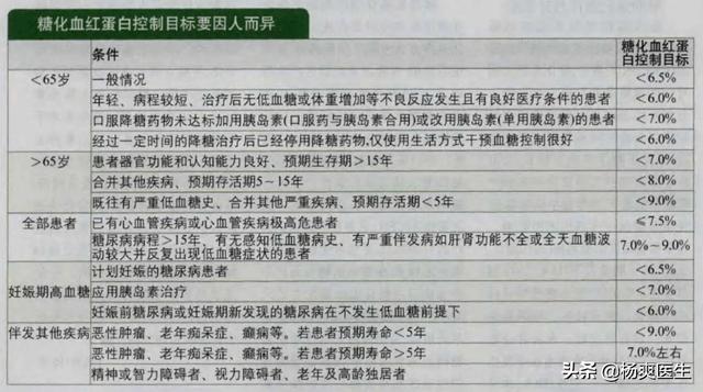 Si l'espérance de vie est inférieure à 5 ans, l'hémoglobine glyquée peut être contrôlée à 9 %. Si l'espérance de vie est supérieure à 5 ans, l'hémoglobine glyquée peut être contrôlée à environ 7 % si possible. Si le patient souffre d'hypoglycémies récurrentes, l'hémoglobine glyquée peut être contrôlée entre 7 et 9 %. Il ne s'agit donc pas d'une déclaration générale selon laquelle l'hémoglobine glyquée doit être inférieure à 6,5 %, cela dépend principalement de l'âge du patient, de son espérance de vie, des complications et de l'existence ou non de réactions hypoglycémiques récurrentes.