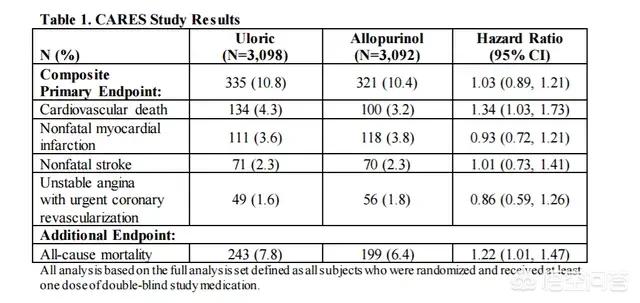 La conclusion de la FDA est claire :Des données sur plus de 3 000 cas de fébuxostat et d'allopurinol ont été incluses. Les décès dus à des événements cardiovasculaires étaient de 4,3 % pour le fébuxostat et de 3,2 % pour l'allopurinol ; les infarctus du myocarde non mortels étaient de 3,6 % pour le fébuxostat et de 3,8 % pour l'allopurinol ; les accidents vasculaires cérébraux non mortels étaient de 2,3 % pour le fébuxostat et de 2,3 % pour l'allopurinol ; et l'angine instable nécessitant un traitement urgent était de 1,6 % pour le fébuxostat et de 1,8 % pour l'allopurinol. Allopurinol : 1,6 % pour le fébuxostat et 1,8 % pour l'allopurinol ; et mortalité toutes causes confondues : 7,8 % pour le fébuxostat et 6,4 % pour l'allopurinol.