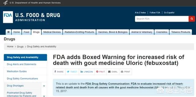 Après des mois d'enquête, la Food and Drug Administration (FDA) des États-Unis a publié un communiqué de presse indiquant que le fébuxostat, un médicament couramment utilisé pour abaisser le taux d'acide urique, peut augmenter le risque de décès, et la FDA a exigé que le médicament soit emballé avec un avertissement de boîte noire indiquant qu'il "peut augmenter le risque de décès cardiovasculaire et de mortalité toutes causes confondues". La FDA exige également que le médicament soit strictement limité au traitement de deuxième intention de la goutte, c'est-à-dire aux patients atteints de goutte qui ne répondent pas bien au traitement par allopurinol à dose maximale ou qui ne tolèrent pas le traitement par allopurinol. Remarque : le fébuxostat ne doit pas être utilisé chez les patients hyperuricémiques sans antécédents de goutte.