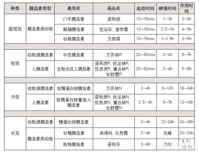 En fonction de la durée d'action de l'insuline, ils peuvent être classés en analogues de l'insuline à action rapide (ultrarapide), en insuline à action brève (ordinaire), en insuline à action intermédiaire, en insuline à action prolongée (y compris les analogues de l'insuline à action prolongée) et en insuline prémélangée (y compris les analogues de l'insuline prémélangée).Actuellement, l'insulinothérapie ne peut se faire que par injection, mais l'insuline orale est un rêve pour les scientifiques.