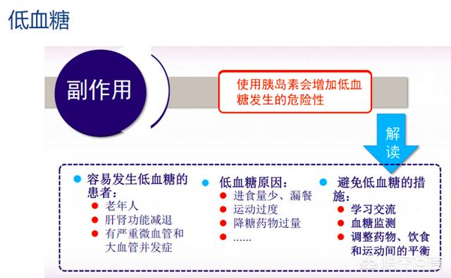 Afin d'éviter les réactions hypoglycémiques dues à un dosage relativement important d'insuline, il est nécessaire de commencer par un petit dosage, de surveiller étroitement la glycémie et d'ajuster progressivement le dosage d'insuline pour atteindre le bon dosage qui permet de contrôler la glycémie sans hypoglycémie. Ces patients doivent avoir sur eux des bonbons, des desserts et d'autres denrées alimentaires afin de pouvoir se sauver à temps en cas de réactions hypoglycémiques.